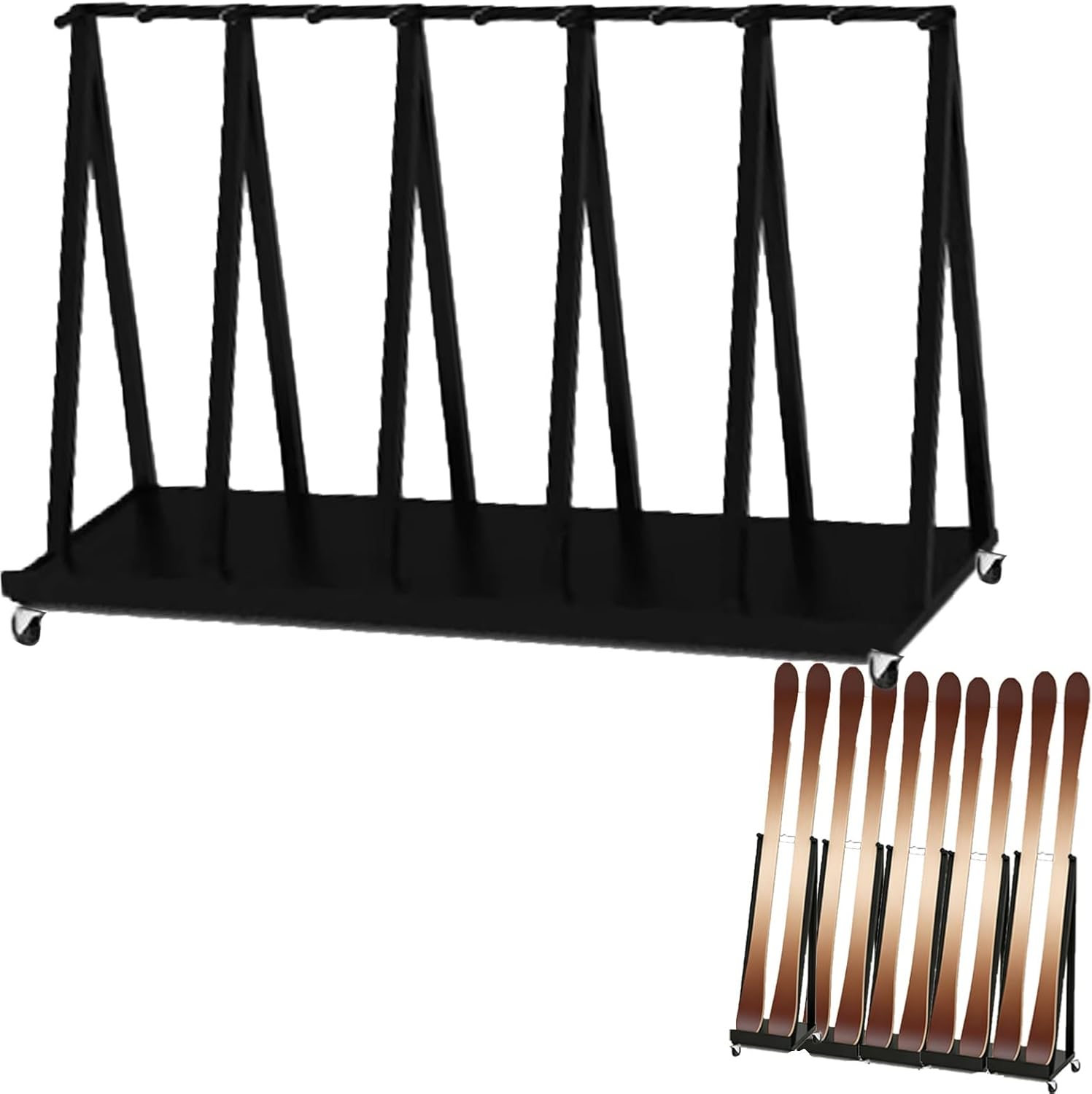 Have you ever had your snowboard leaning against the wall tip over and nearly hit your feet?Have you ever had your snowboards stacked haphazardly with poles scattered everywhere?Choose our snowboard rack—it's not only the ideal storage solution for winter sports enthusiasts but also a practical gift for skiing lovers.❉Package Include:- Ski Rack x 1(Excluding skis)❉Specifications:- Material: Iron- Surface: Varnished- Rack Height: 80 cm (31.5 in)- Rack Depth: 50 cm (19.7 in)- Rack Width: 32 cm (12.6 in) - 177 cm (69.7 in)- Wall Thickness: 2 mm (0.08 in)- Separation Slot Width: 12 cm (4.7 in)- Features: Lockable wheels - Size Available: (Ski) hold 1 pair ski, hold 2 pair ski, hold 3 pair ski, hold 4 pair ski, hold 5 pair ski, hold 6 pair ski,❉Applicable Scenarios:- Features an iron mesh bottom for ventilation.- Features lockable wheels for easy transport.- Can be given as a gift for skiing enthusiasts.- Vertical floor-standing design saves wall space.- Slots with separators to prevent skis from bumping into each other.- Precision welding with thickened materials ensures long-lasting durability.❉Note:- If the goods you received are damaged or missing parts, please contact us by email and we will resend them to you in time.- There may be some 1-2 cm errors in manual measurement, please refer to the actual product.- Colors might slightly vary due to the shoot lights and on different monitors and screens, please refer to the objects received.