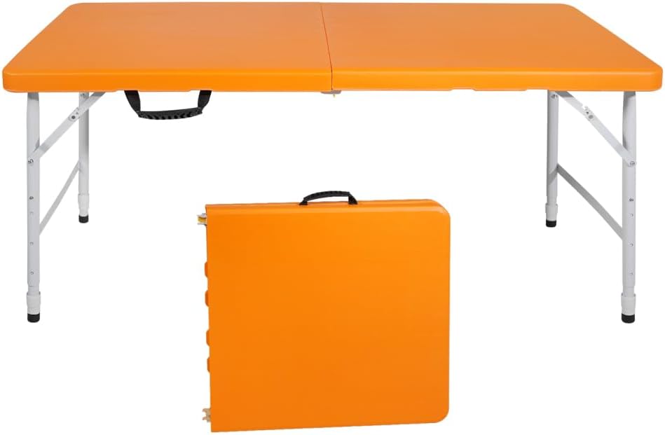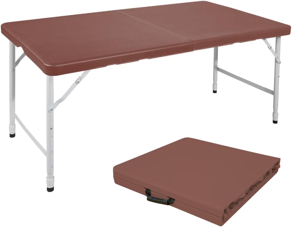 Portable Folding Table with Durable Construction This versatile table combines practical functionality with sturdy materials, offering a reliable surface for various indoor and outdoor activities. The thoughtful design focuses on ease of use, maintenance, and storage. Convenient FeaturesQuick Setup: Foldable design requires no assembly - ready for use in secondsIntegrated Handle: Side-mounted handle and secure closure for comfortable carryingCompact Storage: Folds to slim 3.54" profile for space-efficient storageQuality ConstructionDurable Tabletop: High-density polyethylene with slight texture helps minimize visible scratchesStrong Frame: 25mm powder-coated steel tubing with 1mm wall thicknessSecure Stability: Non-slip rubber feet and reinforced joint fasteners prevent shiftingLightweight Design: Weighs only 8.5 kg for easy transportationTechnical SpecificationsOpen Dimensions: 49.21"L × 24.02"W × 28.98"HFolded Dimensions: 24.41"L × 24.02"W × 3.54"HPackage Size: 26.38"L × 3.54"W × 27.95"HMaterials: HDPE plastic top with powder-coated steel frameVersatile ApplicationsIdeal as dining table for outdoor gatherings and barbecue eventsSuitable as play table for children's activitiesPerfect as serving table or display surface for various occasionsAdaptable for home use or outdoor events This practical table delivers reliable performance through its durable materials and user-friendly design, providing a versatile surface solution that easily transitions between active use and compact storage.