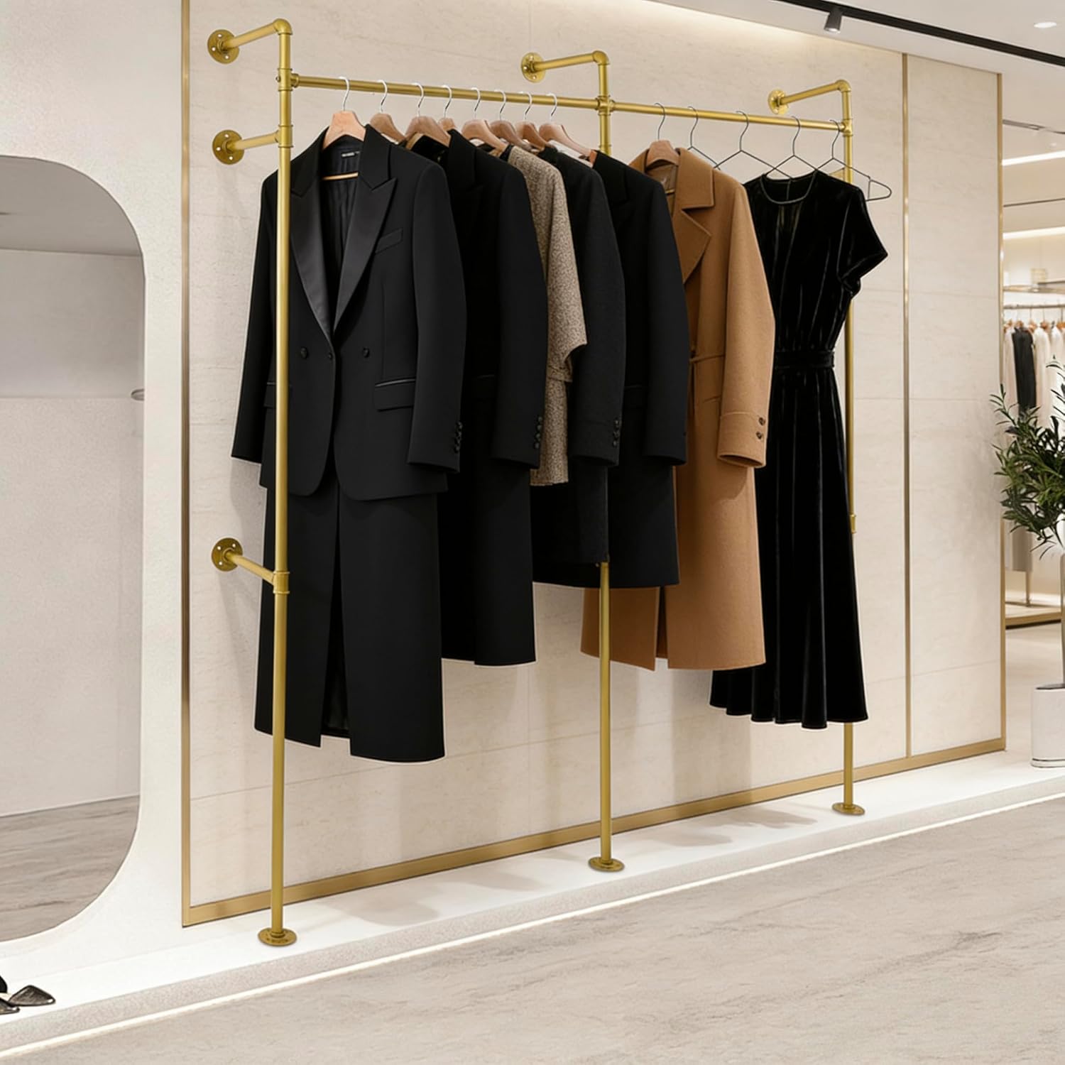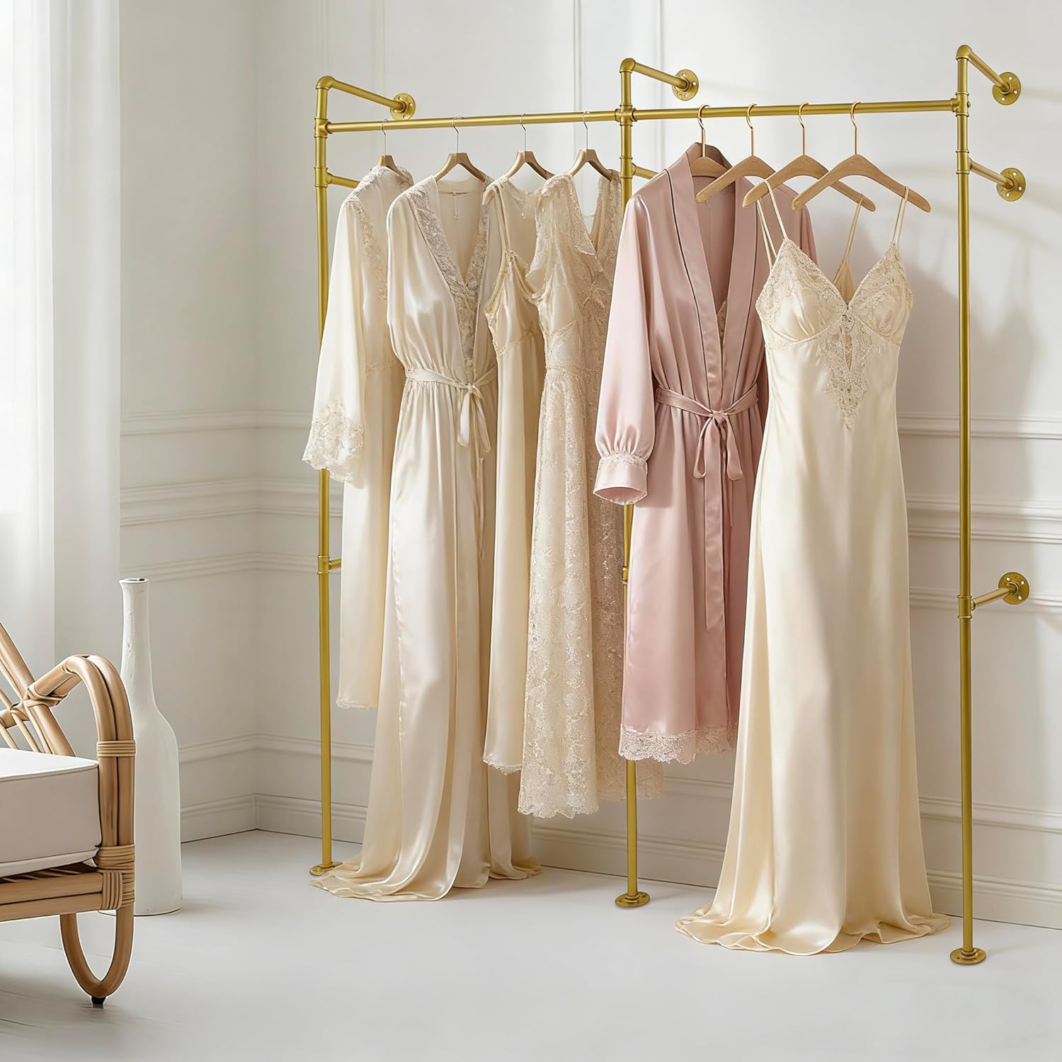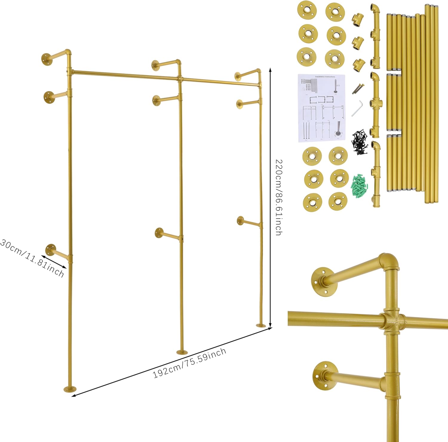 Boutique display clothes rack retail clothing garment-racks. Hanging clothing rack for bedroom or boutiques.Wedding dress rack display clothes, dress, clothing evening gown, wedding dress ect. Heavy duty garment racks stand. Metal clothing store hanger storage shelves,wall mount display rack. Specifications:Type: Wedding dress rack wall mount metal garment rack display rack for hanging clothes boutique retail display Color: GoldStyle: IndustrialShape: RectangularMaterial: Iron PipeProcess: Welding, High-temperature Baking Paint Mount Type: Wall-MountedAssembly Required: YesProduct Size(L*H): 192*220cm/75.59*86.61 inDistance from the Wall: 30cm/11.81 inTotal Load-bearing Capacity: About 50kg/110.23 lbsNet Weight: 7.5kg/16.53 lbsIncluded1 * Wall-mounted Clothing Rack1 * English Installation DiagramOther Accessories for InstallationPerfect Use: Retail display boutique rack. Provides hanging space for costumes or clothing in your clothing store, bedroom, theater, dance studio, or workshop. Also ideal for hallways, entrances, bedrooms, closets, laundry rooms, or balconies. The shimmering Gold makes the rack more eye-catching and stylish. Wedding Dress Rack Suitable for boutique retail displays or home/commercial use. Gold-plated rack with excellent balance.
