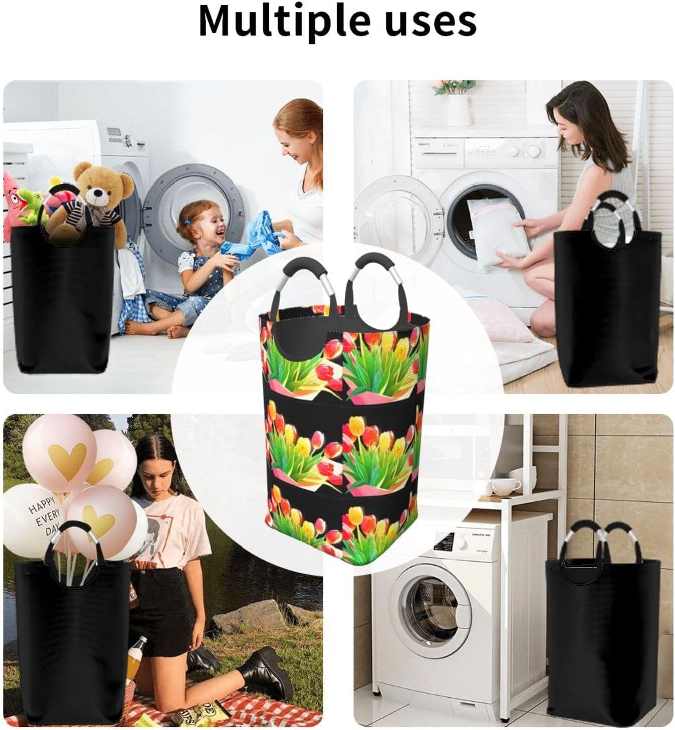 Our A bouquet of tulips dirty clothes storage bag is made of polyester, which is lightweight and flexible. It can maintain a stable shape even under heavy pressure and collision. At the same time, the incorporation of Oxford cloth material significantly improves the durability of the product, and it is resistant to wear, bumps and pulling. The storage bag is designed with a large capacity, which can easily carry winter clothes, daily clothes and a variety of sundries. It is easy to carry and store, and fits tightly into the gap of the suitcase after folding. The aluminum handle is sturdy and reliable, supports hanging, and is suitable for a variety of places. In terms of design, it adopts leak-proof technology, combined with waterproof coating and precision sewing, which is effectively waterproof. The exterior uses cutting-edge transfer technology, and a PE board support is added at the bottom to ensure stable load-bearing and prevent tipping. This storage bag is practical and easy to use, and is an ideal choice for travel and home.