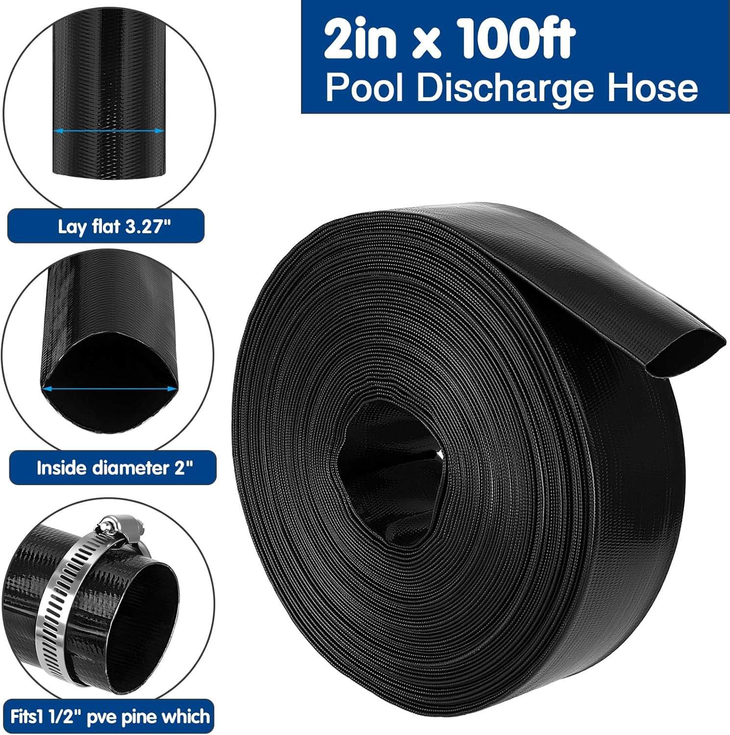 Pump Hose Standard:Diameter: 2inch; Inside width: 3.27inch; Length: 100 feet;Working pressure: 90PSITemperature Range : 23°F to 149°F (-5°C to 65°C)Multifunctional applicationBack wash hose effortlessly handles swimming pool maintenance, garden irrigation, construction site drainage, and more. This heavy-duty backwash hose is your ultimate solution for multiple tasks! Durable MaterialThis sump pump hose made of thick, reinforced PVC with polyester yarn, this pool backwash hose resists UV, chemicals.Easy to StorageLightweight, lay flat hose rolls up for compact storage. Attaches like a garden hose-no tools needed. Perfect for quick setups and space-saving storage.Huge Water Output2" inner diameter allows fast water flow. Ideal for large pools, floods, or irrigation. The pool waste hose delivers high efficiency without clogging.