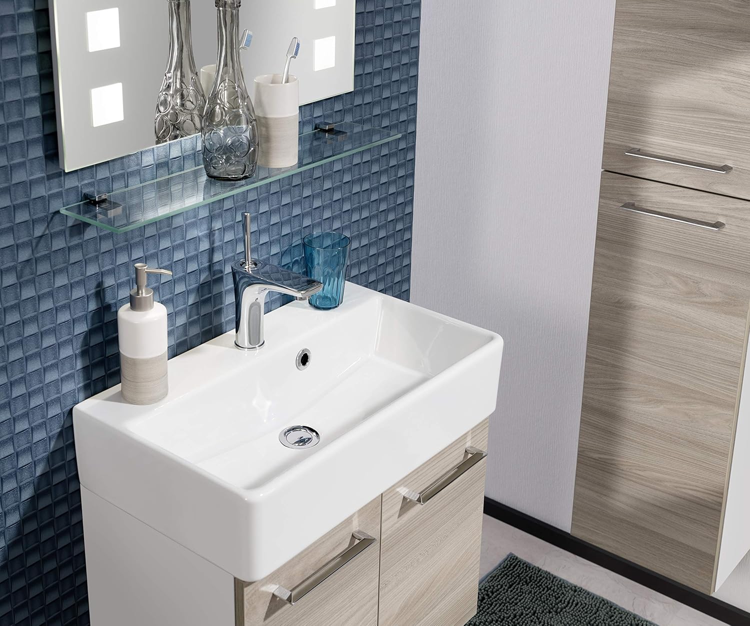 Fackelmann Lima vanity unit. The vanity unit from Fackelmann is deep-reduced and therefore also suitable for narrow bathrooms. The doors can be easily opened thanks to the shiny chrome handles and gently closed with the dampened hinges. With the simple assembly instructions (English language not guaranteed), the installation of the bathroom furniture is very easy. Beautiful baths hot FACKELMANN Contents: 2 x door, 2 x chrome shiny handle, 1 x body. Colour (body): white. Colour (front): brown (stone ash look – moisture-proof wood imitation). Dimensions (W x H x D): approx. 59 x 42 x 33 cm. From bathroom to feel-good temple. Turn your bathroom into a paradise for all the senses with the right furniture. Whether pre-assembled or disassembled for economical self-assembly - FACKELMANN offers you a variety of furniture solutions. So your bathroom becomes a real highlight and gets a very special character. Let the bathroom furniture emphasise the individual style of your dream bathroom - and enjoy your own small wellness oasis. Fackelmann has been producing bathroom furniture at the Hersbruck site since 1963. Thanks to decades of experience, we offer top quality and competent service.