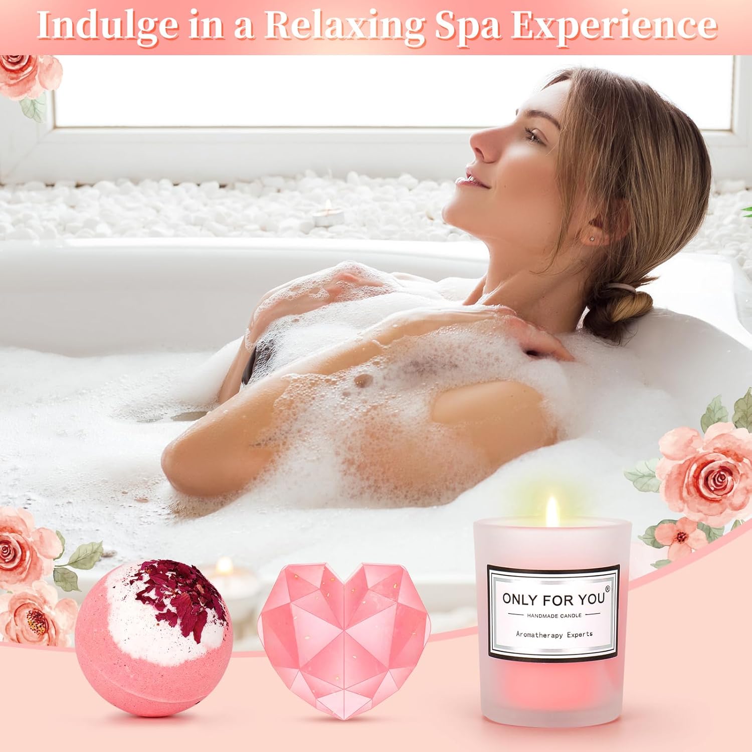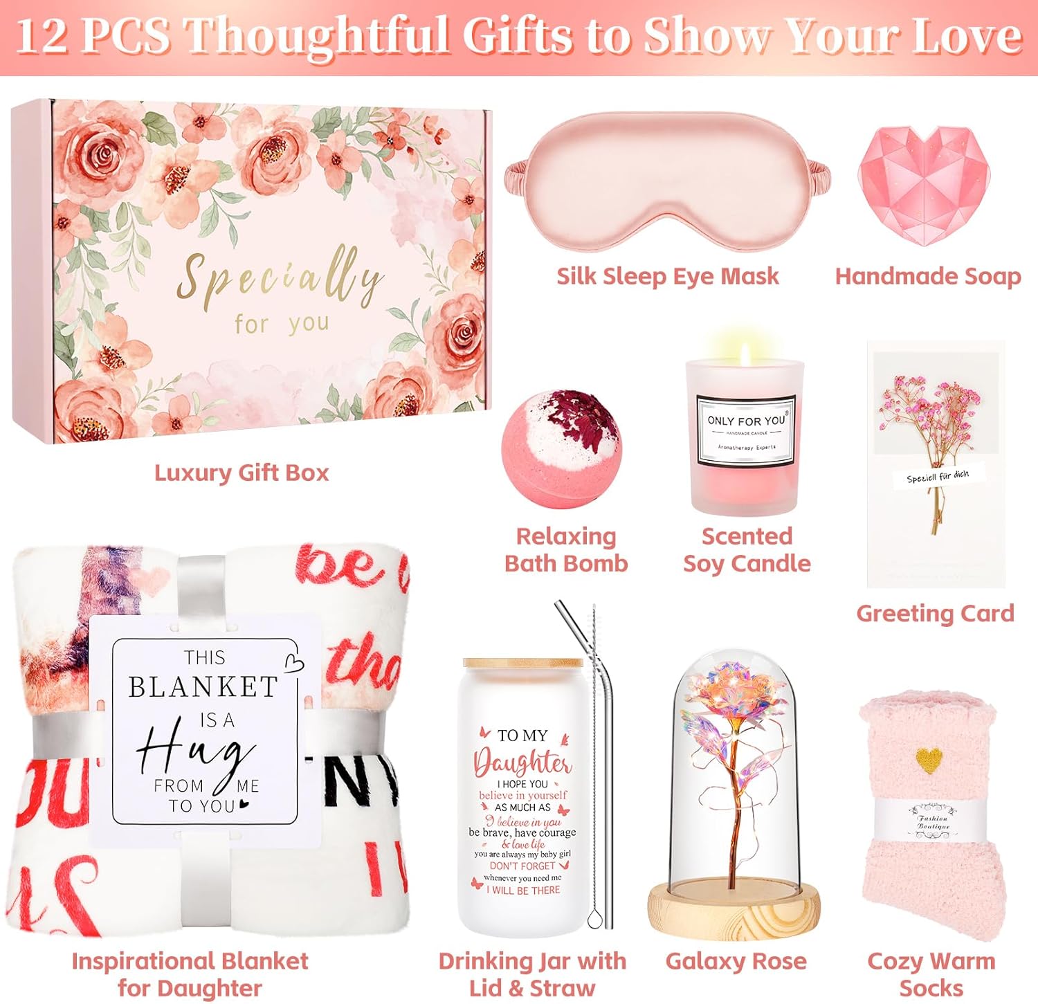 | Included Components | message blanket, 16oz insulated tumbler with lid and straw, straw brush,scented soy candle, fuzzy socks, bath bomb, handmade soap, eye mask, and a delicate greeting card |