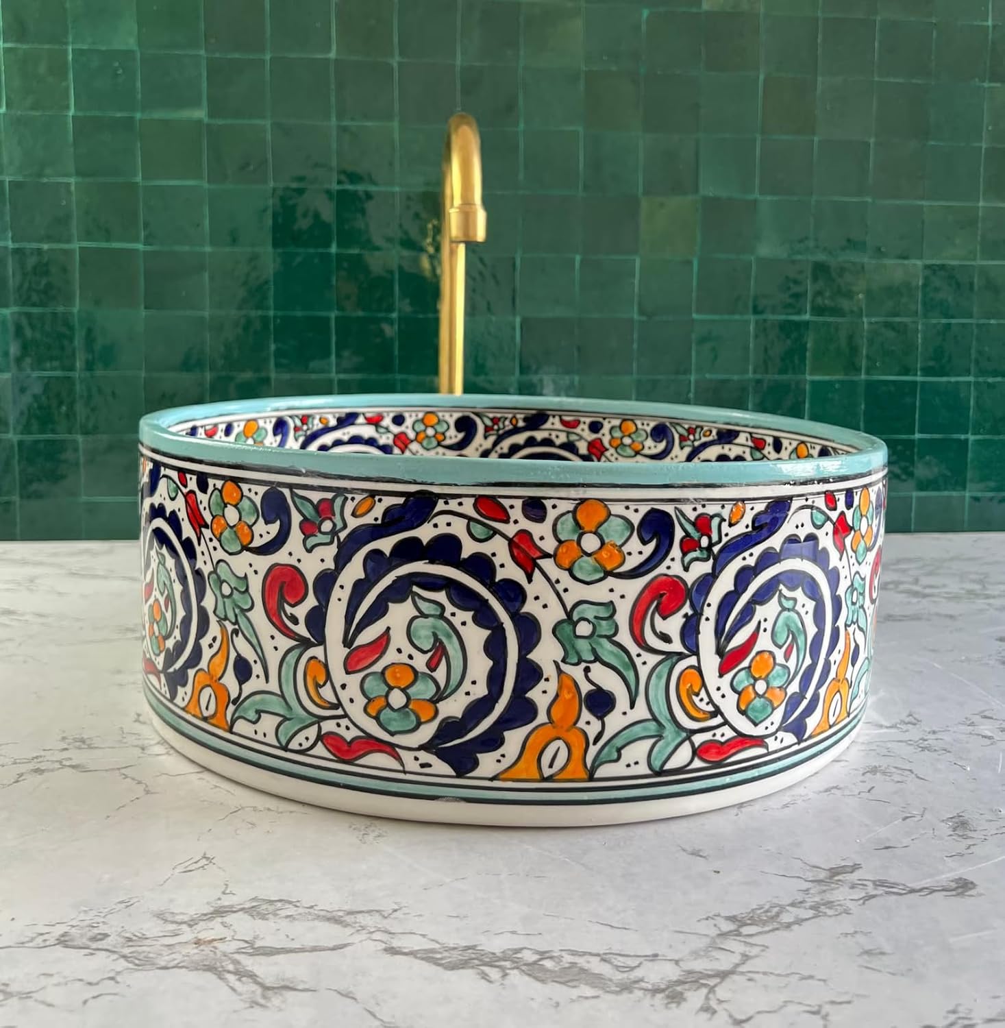 This Handmade Countertop Ceramic Wash Basin Vessel Sink is presenting a truly exquisite and unique gift for the discerning homeowner or design enthusiast. This artisan-crafted sink is a testament to both functionality and aesthetic appeal, elevating any bathroom space with its charm and character. Crafted with meticulous attention to detail, this Sink boasts a distinctive design that seamlessly blends modern elegance with a touch of classic charm. The intricate patterns are hand-painted, showcasing the artisan's skill and dedication of MiIRATILE's artisans to creating a one-of-a-kind piece. The result is a stunning Sink Bowl that adds a splash of artistic flair to any bathroom decor. Designed for above-counter installation, this Hand Painted Vessel Sink stands as a striking focal point in the bathroom. Its raised profile not only adds visual interest but also allows for easy cleaning and maintenance. The farmhouse-inspired aesthetic of this Ceramic Basin brings a rustic yet sophisticated vibe to the space, making it a perfect addition to both contemporary and traditional settings. Practicality meets style with the included drain, ensuring seamless functionality and convenience. The durable ceramic construction not only enhances the sink's longevity but also provides a smooth, easy-to-clean surface. This Handmade Countertop Ceramic Wash Basin Vessel Sink is more than just a utilitarian fixture โ it's a work of art that transforms the bathroom into a personalized sanctuary. Whether it's for a housewarming, a special occasion, or a thoughtful gesture to someone who appreciates craftsmanship and design, this Farmhouse Bathroom Ceramic Basin with drain is bound to leave a lasting impression. Gift a touch of artisanal luxury and elevate the bathroom experience with this exceptional and handcrafted vessel sink.