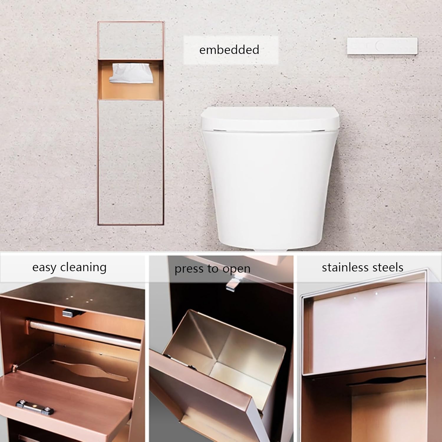 Brand: HJLKDYMFeatures1: This niche is a hidden niche and requires tiling.2: Double-sided painting Fully welded and seamless, anti-scratch and anti-scratch, no fingerprints.Product SpecificationProduct Name: Hidden Trash Can NicheMaterial: stainless steelColor: Black , Gold , Gray , DProduct Features Does not take up floor space.Product Dimensions Depth: 15cm/5.5inLxH20x62cm1 cm = 0.39 in.1 inch = 2.54 cmPackage includes1 x Concealed trash can nichePlease noteAdhesive must be supplied