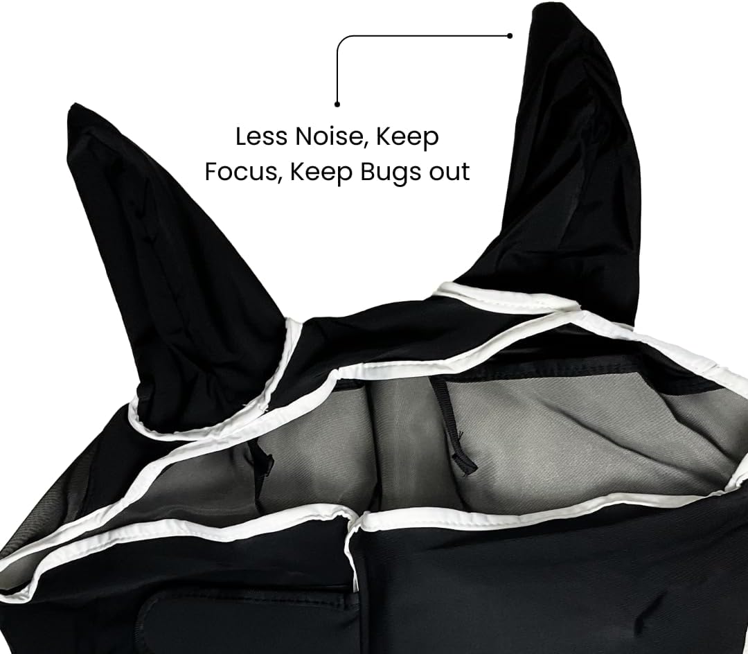 This lightweight fly mask is made from durable, fine mesh for long-lasting wear and full visibility. It features a center hole at the poll for forelock protection and fine mesh ear covers with adjustable Velcro under the throat for a secure fit. The soft fleece lining around the edges minimizes rubbing and provides all-day comfort, keeping the mesh away from the eyes to prevent pressure marks and block dust. Easy to attach over the bridge, this mask is comfortable and nonrestrictive, reducing head-tossing caused by flies for a safer ride. The translucent mesh allows for high visibility, reduces sun exposure, and blocks at least 60% of UV rays, while eye darts keep the mask lifted away from the eyes for added comfort.