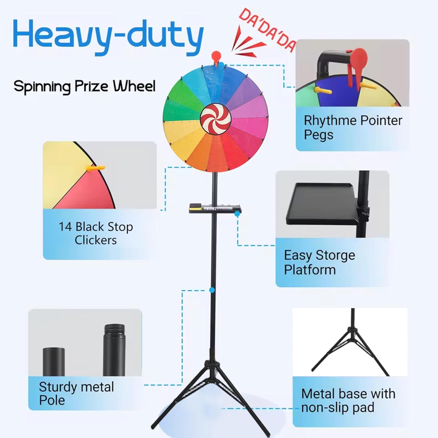 Description: This 24 Inch Prize Wheel with 14 vibrant color slots makes an engaging and visually appealing game experience suitable for both adults and kids. The adjustable tripod stand ensures stable support and customizable height for versatile placement, whether in classrooms, parties, or promotional events. Equipped with dry erase markers, an eraser, and a built-in tray, this spin the wheel game allows quick and easy customization of prize categories, enhancing interactivity and excitement. Made from sturdy materials, the spinner wheel is built to withstand frequent use while remaining lightweight for easy transport and storage. Ideal for prize giveaways, educational activities, or fun competitions, this spinning wheel promotes social interaction and joyful participation while meeting the needs of various event organizers and game facilitators. Its user-friendly design and reliable construction make it a top choice for anyone looking to add dynamic incentives and a lively atmosphere to any gathering. Features:. -Color: Colorful. -Material: Steel. -Size: 61 cm/24 inch. Adjustable Height 100-165 cm/39.4-65 inch. Note:Manual measurement, please allow slight errors on size.The colors may exist slight difference due to different screens. Package Including 1 * Prize Wheel