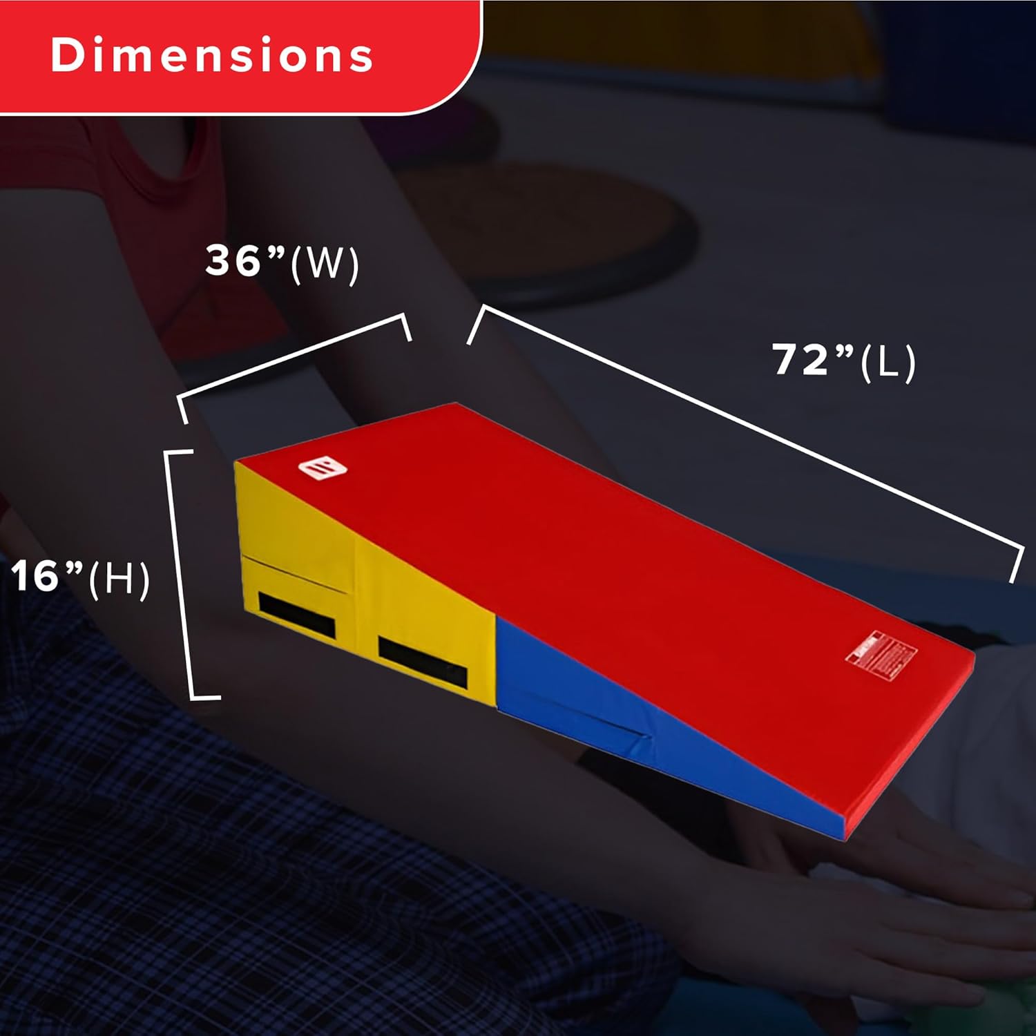 Perfect for Gymnastic Skill Development Incline mats are at the heart of any progressive skill development program and our gymnastics cheese wedge skill mat is perfect for beginning gymnasts, cheerleaders, kids, or adults wanting to perfect their skills. Whether you're training for bars, vaulting, or just basic tumbling and conditioning you can benefit greatly from our commercial grade incline mat. Because of its light weight and convenient carrying handles, it’s easily portable, so trainers can use it to help teach front hand springs, back hand springs and walk overs at home, in the gym or outdoors. Designed for Durability and Safety We Sell Mats Gymnastics Incline Mat is designed to make workouts safer and more comfortable. This elevated wedge is intended for gymnastics, stretching, yoga, Pilates, core workouts, light bodyweight exercises and for kids who tumble, spar, kick, or practice martial arts. Its high-density foam core absorbs impact to support joints and protect your knees, wrists, legs and back throughout your activities.