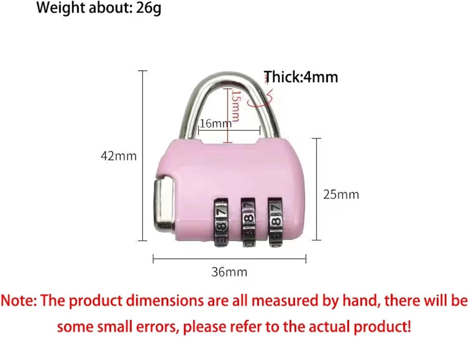 Hinges / LatchMaterial: zinc alloyColor: as picturePackage: 1 pcsSize:length * width 4*3.5cmConversion: 1inch=2.54cm, 1cm=0.393inches Lock Type : Keyed Padlock Model Number : Password Code LockSize : 43*36*10mm